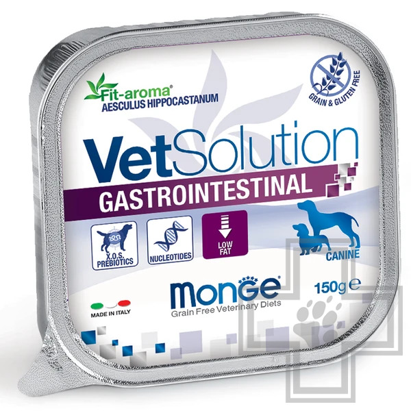 Monge VetSolution Dog Gastrointestinal – ветеринарный диетический корм при заболеваниях желудочно-кишечного тракта, таких как острый и хронический гастрит, расстройства моторики желудка энтерит и воспалительные заболевания кишечника, энтеропатии с потерей белка, синдром короткой кишки и избыточный бактериальный рост в тонком отделе кишечника, колит, а так же при остром и хроническом панкреатите (для собак, НЕ страдающих ожирением и гипертриглицеридемией).