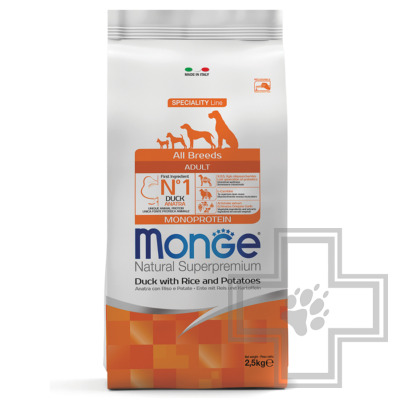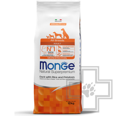 Monge Monoprotein Корм для взрослых собак всех пород, с уткой, рисом и картофелем