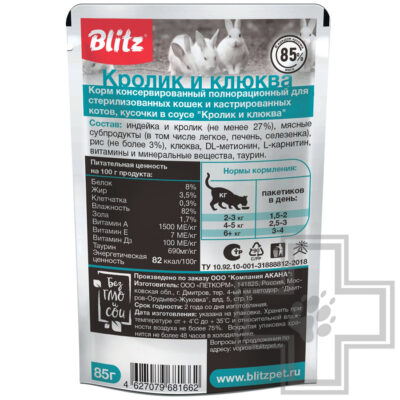 Blitz Sensitive Пресервы для стерилизованных кошек, с кроликом и клюквой