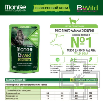 Monge Cat BWild GRAIN FREE Пресервы беззерновые для стерилизованных кошек, с диким кабаном и овощами