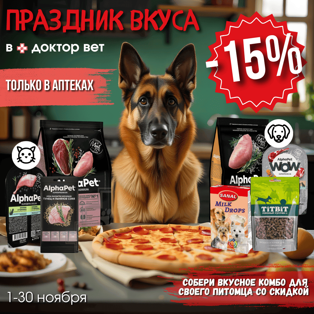 С 1 по 30 ноября приобретайте в аптеках «Доктор Вет» наборы для котов и собак со скидкой 15%!
