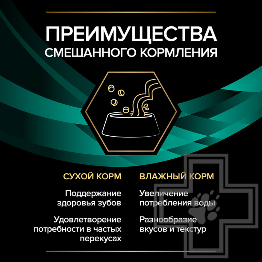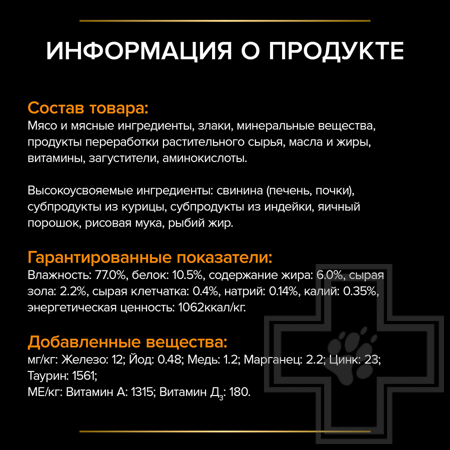 | Состав | Мясо и мясные ингредиенты, злаки, минеральные вещества, продукты переработки растительного сырья, масла и жиры, витамины, загустители, аминокислоты. Высокоусвояемые ингредиенты: свинина (печень, почки), субпродукты из курицы, субпродукты из индейки, яичный порошок, рисовая мука, рыбий жир.