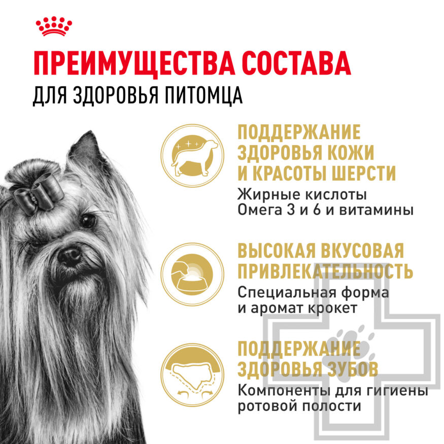 Корм ROYAL CANIN Yorkshire Terrier Adult, предназначенный для собак породы йоркширский терьер старше 10 месяцев, разработан в соответствии со всеми потребностями вашей взрослой собаки в питательных веществах.