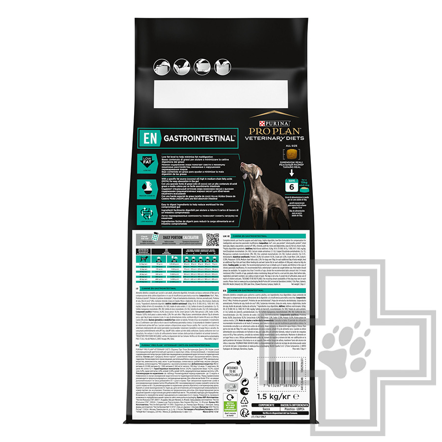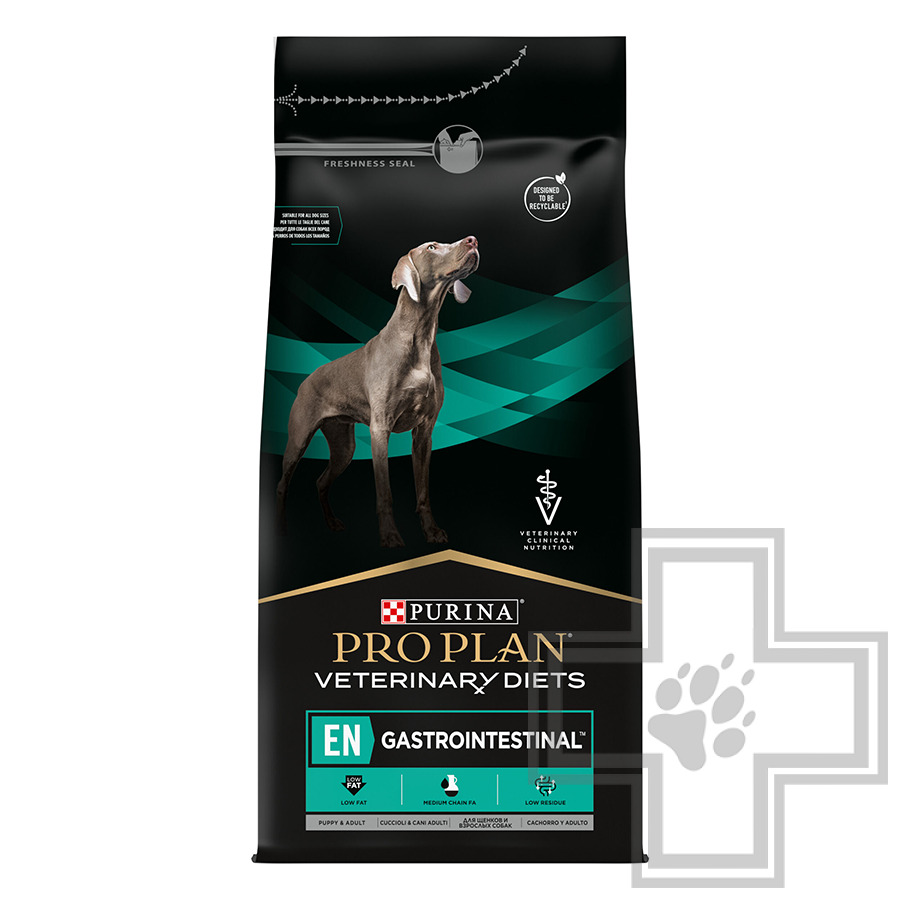 Pro Plan VETERINARY DIETS EN Gastrointestinal Корм сухой полнорационный диетический для щенков и взрослых собак при расстройствах пищеварения. Корм рекомендуется для компенсации расстройств пищеварения и нарушения экзокринной функции поджелудочной железы, с высокой усвояемостью ингредиентов и низким содержанием жира. Повышенный уровень электролитов и высокая усвояемость позволяют применять этот рацион для снижения острых нарушений кишечного всасывания.