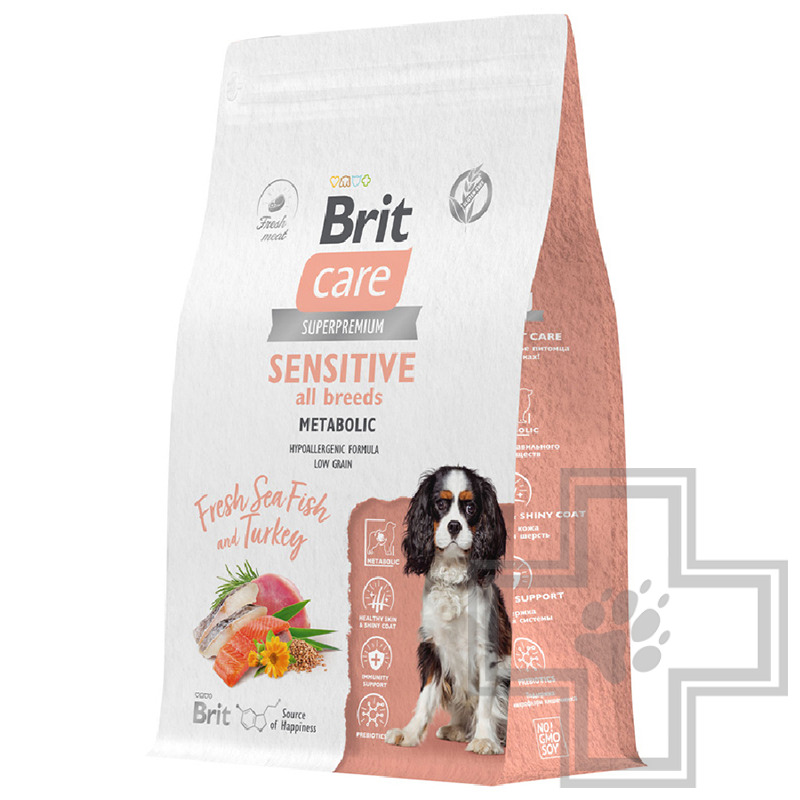 Brit Care Dog Adult Sensitive Metabolic — полнорационный сухой корм супер премиум-класса с морской рыбой и индейкой для взрослых собак всех пород. Улучшенный обмен веществ. Большинство современных собак ведут малоподвижный образ жизни. Это приводит к нарушению обмена веществ и набору излишнего веса.