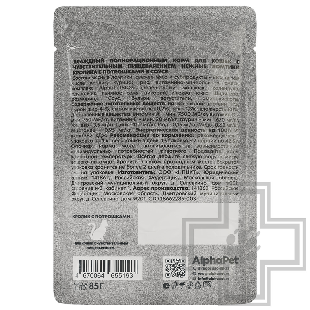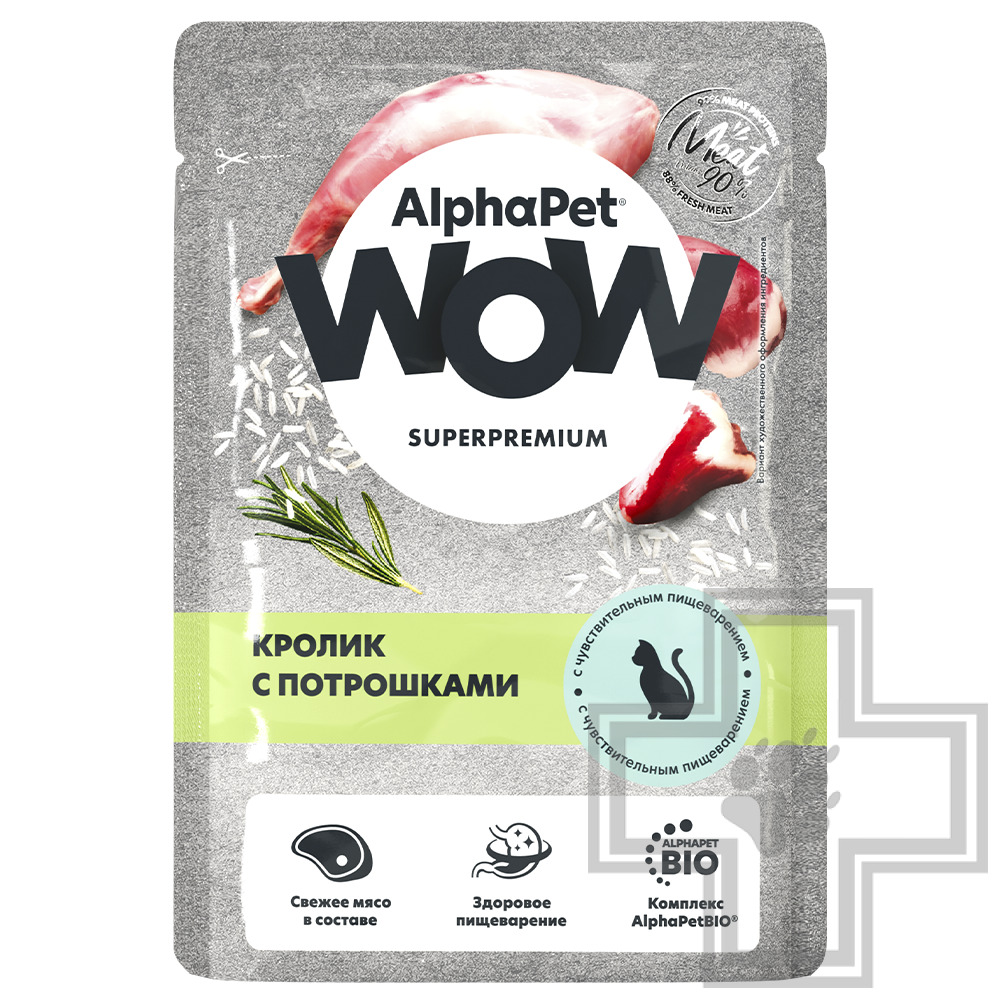 AlphaPet WOW Superpremium — влажный полнорационный корм для кошек с чувствительным пищеварением нежные ломтики кролика с потрошками в соусе.