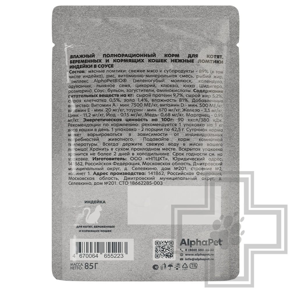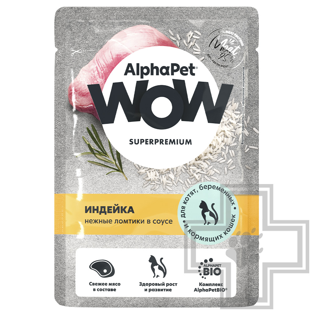 AlphaPet WOW Superpremium — влажный полнорационный корм для котят, беременных и кормящих кошек нежные ломтики индейки в соусе.