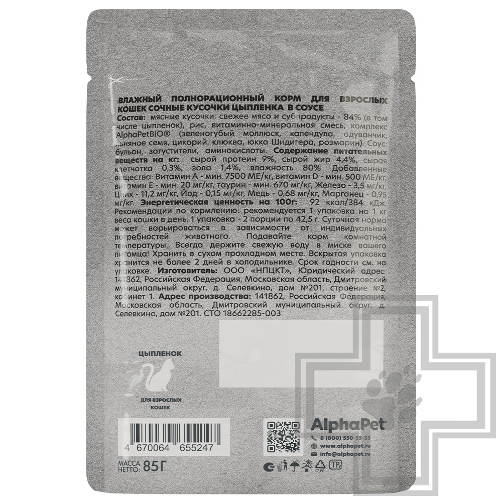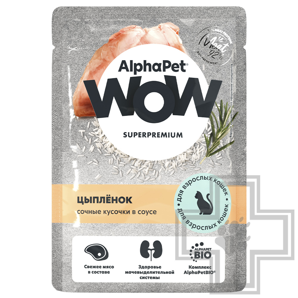 AlphaPet WOW Superpremium — влажный полнорационный корм для взрослых кошек сочные кусочки цыпленка в соусе.