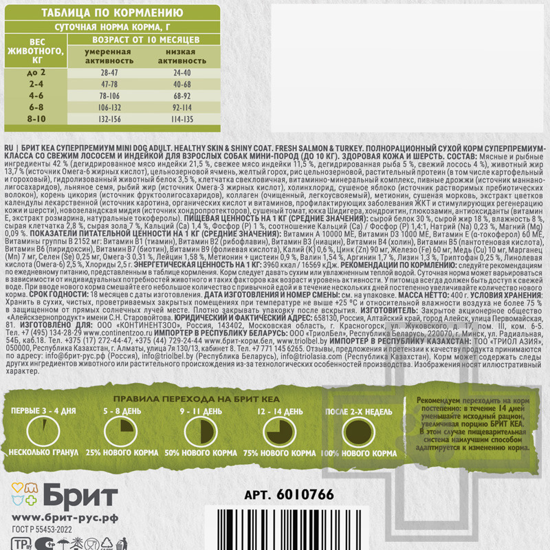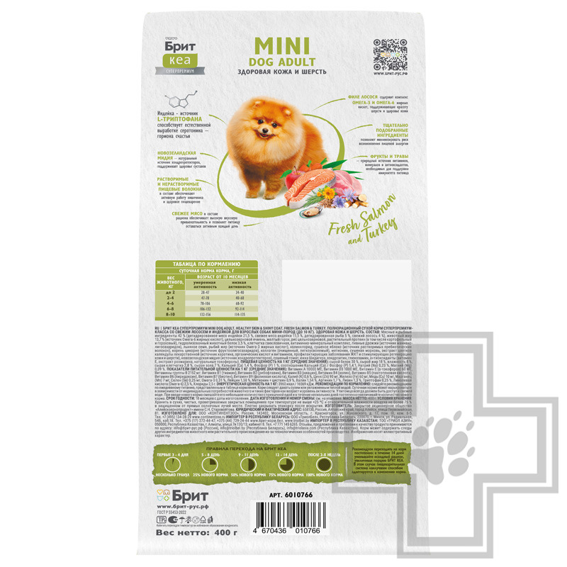 Brit Care (Брит Кеа) Mini Superpremium Dog Adult Healthy Skin & Shiny Coat — это полнорационный сухой корм суперпремиум-класса, специально разработанный для взрослых собак мини-пород весом до 10 кг. С уникальным составом, включающим свежий лосось и индейку, корм богат незаменимыми жирными кислотами Омега-3 и Омега-6, которые поддерживают здоровье кожи и шерсти, делая их более блестящими и ухоженными.