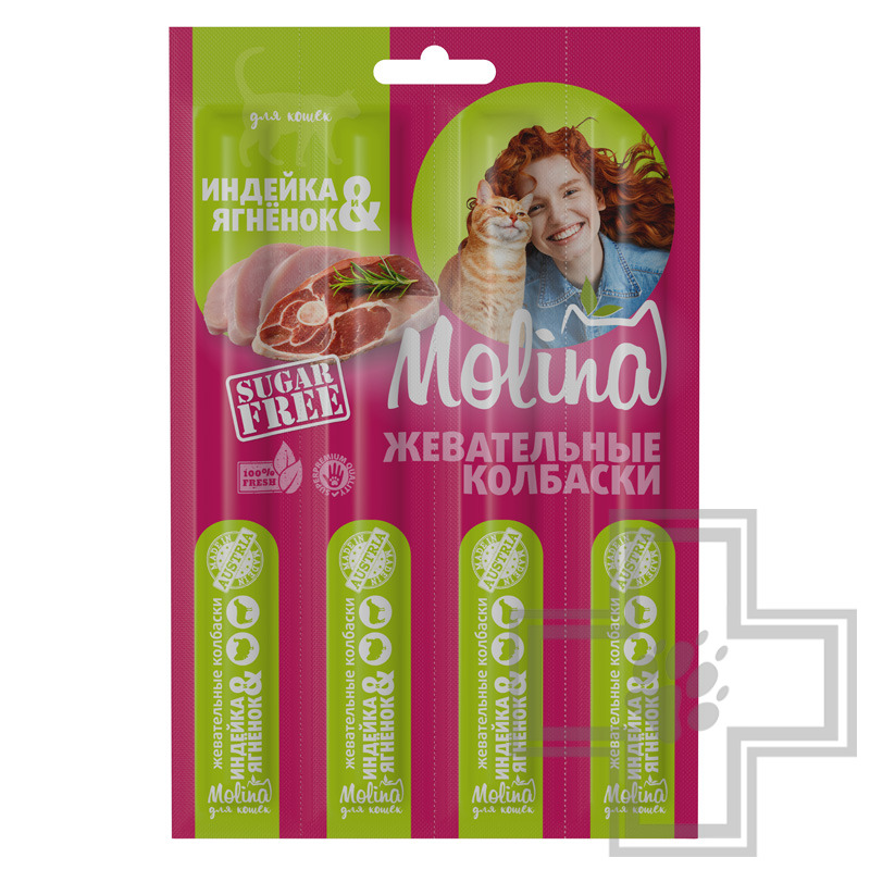 Molina (Молина) Жевательные колбаски из индейки и ягненка — безупречно вкусное и полезное лакомство класса Holistic для кошки. 95% цельного натурального мяса, из них индейка 26%, ягненок 14%.