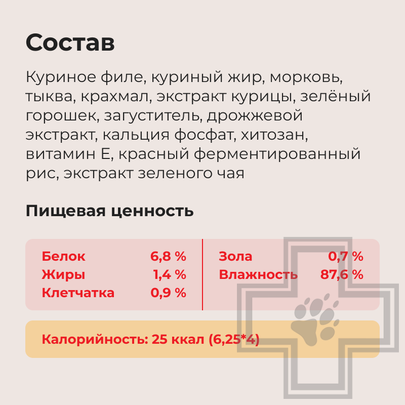 куриное филе, куриный жир, морковь, тыква, крахмал, экстракт курицы, зелёный горошек, загуститель, дрожжевой экстракт, кальция фосфат, хитозан, витамин Е, красный ферментированный рис, экстракт зеленого чая Питательные вещества: белок – 6,8 %, жиры – 1,4%, клетчатка – 0,9%, зола – 0,7%, влажность – 87,6% Энергетическая ценность на упаковку: 25 кКкал.