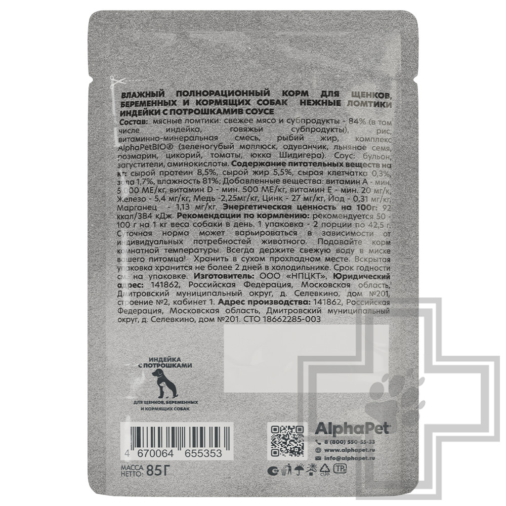 AlphaPet WOW Superpremium – влажный полнорационный корм для щенков, беременных и кормящих собак нежные ломтики индейки с потрошками в соусе.
