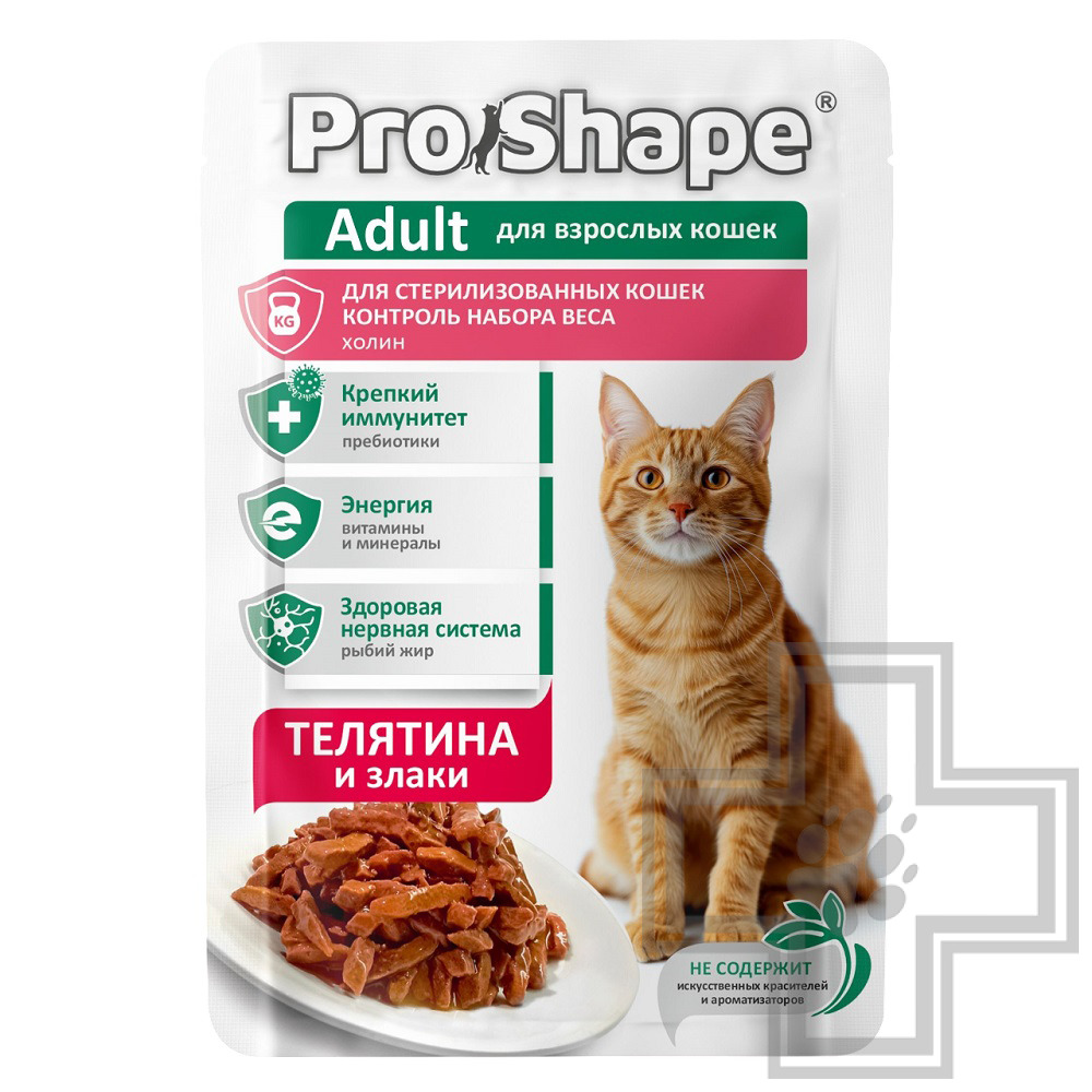 ProShape Adult – консервированный полнорационный корм с телятиной и злаками в соусе для взрослых стерилизованных кошек и кастированных котов, для контроля набора веса.
