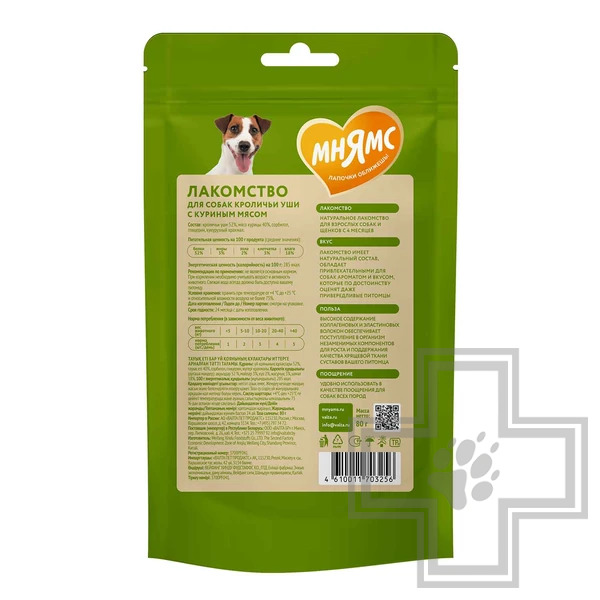 Натуральное лакомство для взрослых и растущих собак (с четырех месяцев). Кроличьи уши с куриным мясом «Мнямс» — это полезное диетическое лакомство, содержащее легкоусвояемый белок. Настоящий деликатес с вялеными ломтиками отборного филе не оставит равнодушным даже самого капризного любимца.
