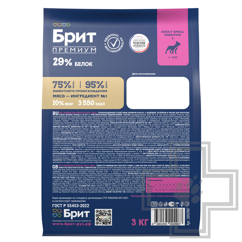 Брит Премиум Dog SENSITIVE Adult Small. Полнорационный сухой корм премиум-класса с индейкой, ягнёнком и рисом для взрослых собак мелких пород (1-10 кг) с чувствительным пищеварением.