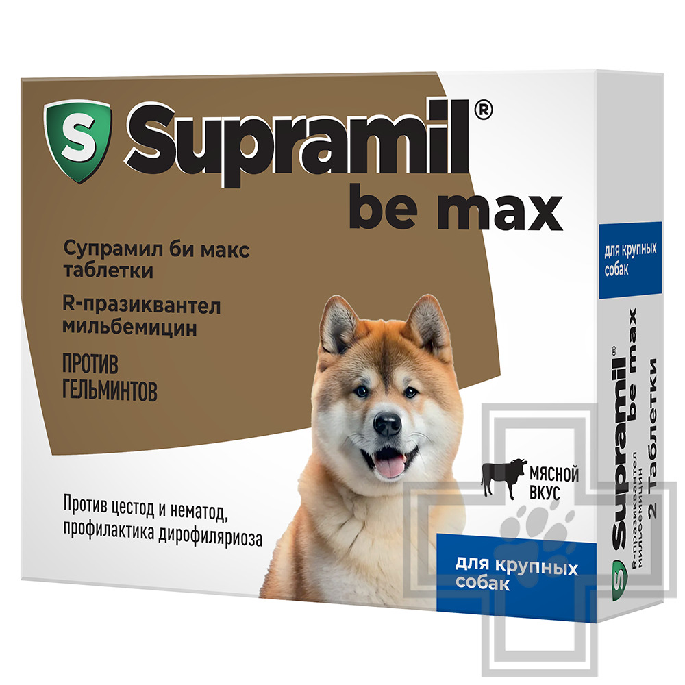 Супрамил би макс (Supramil be max) – антигельминтный препарат широкого спектра действия с улучшенным составом для собак крупнных пород (1 таблетка на 25 кг). Supramil be max максимально безопасно воздействует на организм животных.