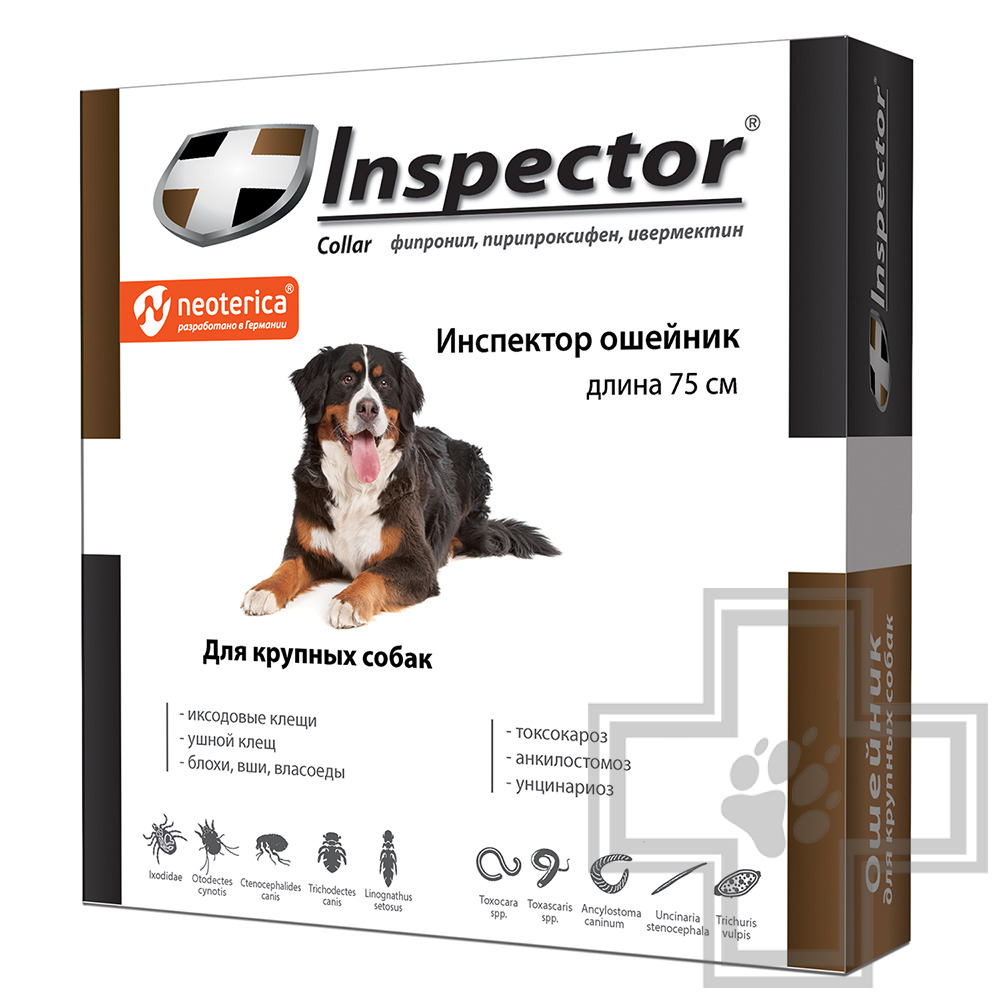 Инспектор (Inspector) ошейник применяют собакам для лечения и профилактики энтомозов, отодектоза, поражении иксодовыми клещами, а также в целях лечения и профилактики нематодозов желудочно-кишечного тракта.