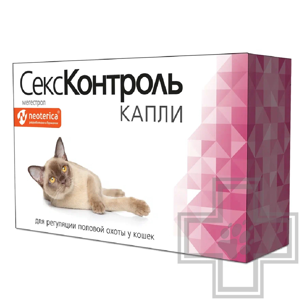 Секс Контроль капли назначают кошкам для задержки и прерывания течки. Не допускается применения Сексконтроль капель при заболеваниях мочеполовой системы, опухолях, диабете. При работе с Секс Контроль каплями следует соблюдать общие правила личной гигиены и техники безопасности, предусмотренные при работе с лекарственными средствами. По окончании работы руки следует вымыть теплой водой с мылом. Людям с гиперчувствительностью к компонентам препарата следует избегать прямого контакта с Сексконтроль каплями. Пустую упаковку из-под лекарственного препарата запрещается использовать для бытовых целей, она подлежит утилизации с бытовыми отходами. При случайном контакте лекарственного препарата с кожей или слизистыми оболочками глаз, их необходимо промыть большим количеством воды. В случае появления аллергических реакций или при случайном попадании препарата в организм человека следует немедленно обратиться в медицинское учреждение (при себе иметь инструкцию по применению препарата или этикетку). Не допускается применения Секс Контроль капель неполовозрелым животным, беременным и лактирующим самкам. СексКонтроль капли вводят животным перорально за 1 - 2 часа до кормления, закапываяая в рот, нанося на кончик носа или на кусочек лакомства. Доза препарата зависит от вида, пола, массы животного и цели его применения. Перед каждым применением флакон с лекарственным препаратом СексКонтроль капли необходимо тщательно встряхнуть. Кошкам Секс Контроль капли применяют: - для задержки течки в период между течками в дозе 0,1 мл - 3 капли (2,5 мг ДВ) на животное один раз в неделю или 0,2 мл — 5 капель (5 мг ДВ) на животное один раз в 2 недели. Курс применения не более 18 месяцев, повторение курса возможно после проявления нормального физиологического цикла; - для прерывания течки при появлении ее первых признаков, но не позже, чем через 2 дня от ее начала в дозе 0,2 мл - 5 капель (5 мг ДВ) на животное в течение 4 - 7 дней (до исчезновения признаков течки плюс один день) с интервалом 24 часа. Побочных явлений и осложнений при применении Сексконтроля капли в соответствии с настоящей инструкцией не выявлено. При длительном применении Сексконтроль капли или повторных курсах приема возможно изменение аппетита, поведенческих реакций и увеличение молочной железы. Симптомы передозировки при применении лекарственного препарата не выявлены. Информация об особенностях взаимодействия с другими лекарственными препаратами отсутствует. Особенностей действия лекарственного препарата при первом приеме или при его отмене не выявлено. Следует избегать пропуска очередной дозы препарата, так как это может привести к снижению его эффективности. В случае пропуска одной дозы применение препарата возобновляют в той же дозе и по той же схеме. Препарат не предназначен для применения продуктивным животным.