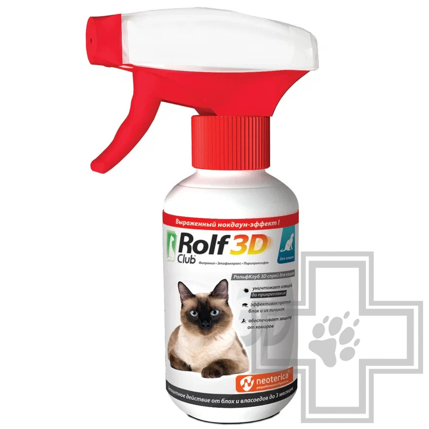 РольфКлуб 3D Спрей для кошек (RolfClub 3D spray for cats) применяют для лечения и профилактики энтомозов, вызываемых блохами и власоедами, акарозов, вызываемых иксодовыми и саркоптоидными клещами, для защиты животных от двукрылых кровососущих насекомых (комаров, мошек и москитов) и профилактики трансмиссивных заболеваний (гемобартонеллез, дирофиляриоз).