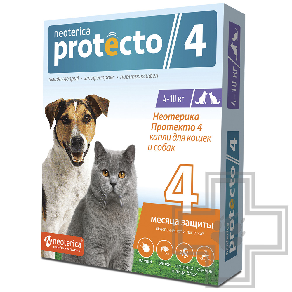 Неотерика Протекто 4 применяют кошкам, собакам и декоративным кроликам с 12-недельного возраста при энтомозах (блохи, вши, власоеды), отодектозе, псороптозе, нотоэдрозе, саркоптозе, демодекозе, поражении иксодовыми клещами и в целях защиты животных от нападения двукрылых кровососущих насекомых и профилактики трансмиссивных заболеваний (бабезиоз, боррелиоз, дирофиляриоз). Противопоказанием к применению Неотерика Протекто 4 является повышенная индивидуальная чувствительность животного к компонентам лекарственного препарата. Не подлежат обработке больные инфекционными болезнями, выздоравливающие кролики, кошки и собаки, а также животные других видов. Не допускается аурикулярное применение препарата (при ушной форме чесотки) при прободении барабанной перепонки. При работе с Неотерика Протекто 4 следует соблюдать общие правила личной гигиены и техники безопасности, предусмотренные при работе с лекарственными средствами. Во время работы запрещается курить, пить и принимать пищу. По окончании работы руки следует вымыть теплой водой с мылом. Не следует мыть, гладить и подпускать животное к маленьким детям в течение 48 часов после обработки препаратом. При случайном контакте лекарственного препарата с кожей или слизистыми оболочками глаз, их необходимо промыть большим количеством воды. Людям с гиперчувствительностью к компонентам препарата следует избегать прямого контакта с Неотерика Протекто 4. В случае появления аллергических реакций или при случайном попадании препарата в организм человека следует немедленно обратиться в медицинское учреждение (при себе иметь инструкцию по применению препарата или этикетку). Не подлежат обработке препаратом Неотерика Протекто 4 беременные и кормящие самки, а также котята, щенки и крольчата моложе 12-недельного возраста. Неотерика Протекто 4 применяют наружно однократно путем точечного («spot on») нанесения на кожу. Извлекают из упаковки, кончик тюбик-пипетки отламывают или отрезают ножницами) и, раздвинув шерсть, наносят препарат на сухую неповрежденную кожу в области шеи у основания черепа или между лопатками (в места, недоступные для слизывания животным) в дозах, указанных в таблице: Вид животного / Доза препарата, мл - Кошки, собаки и кролики (до 4 кг) / 0,4 - Кошки и собаки (4 - 10 кг) / 1,0 - Собаки (10 - 25 кг) / 2,5 - Собаки (25 - 40 кг) / 4,0 - Собаки (40 - 60 кг) / 6,0 При обработке животных массой более 60 кг дозу препарата подбирают из расчета 0,1 мл/кг массы, используя комбинацию пипеток соответствующего объема. Повторные обработки проводят по показаниям, но не чаще 1 раза в месяц. Для уничтожения иксодовых клещей на теле животного лекарственный препарат в количестве 1 капли наносят на клеща и место его прикрепления к коже. Если в течение 20 минут клещ самопроизвольно не отпадает, его аккуратно вытаскивают пинцетом и уничтожают. При отодектозе и псороптозе (ушной чесотке) наружный слуховой проход очищают от струпьев и корок, затем закапывают в каждое ухо по 1-3 капли препарата (в зависимости от размера животного). Ушную раковину складывают вдоль пополам и массируют ее основание. Обработку повторяют 2-3 раза с интервалом 5-7 суток. Лекарственный препарат обязательно вводят в оба уха, даже в случае выявления клинических признаков заболевания только в одном ухе. При тяжелом течении заболевания лечение животного реком