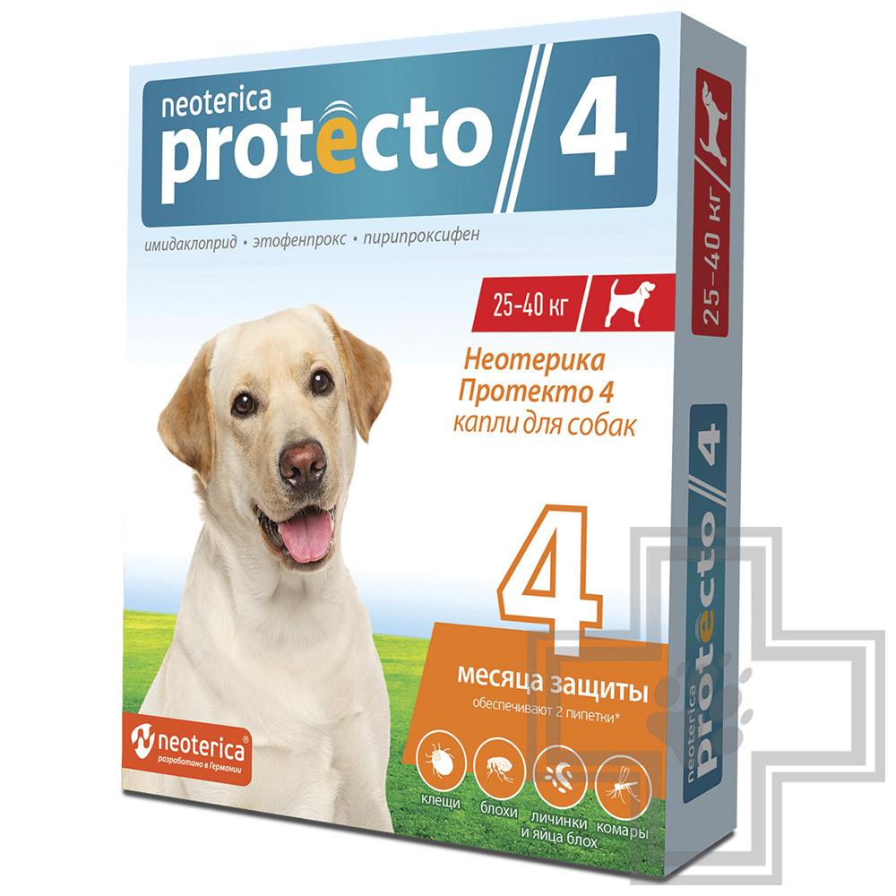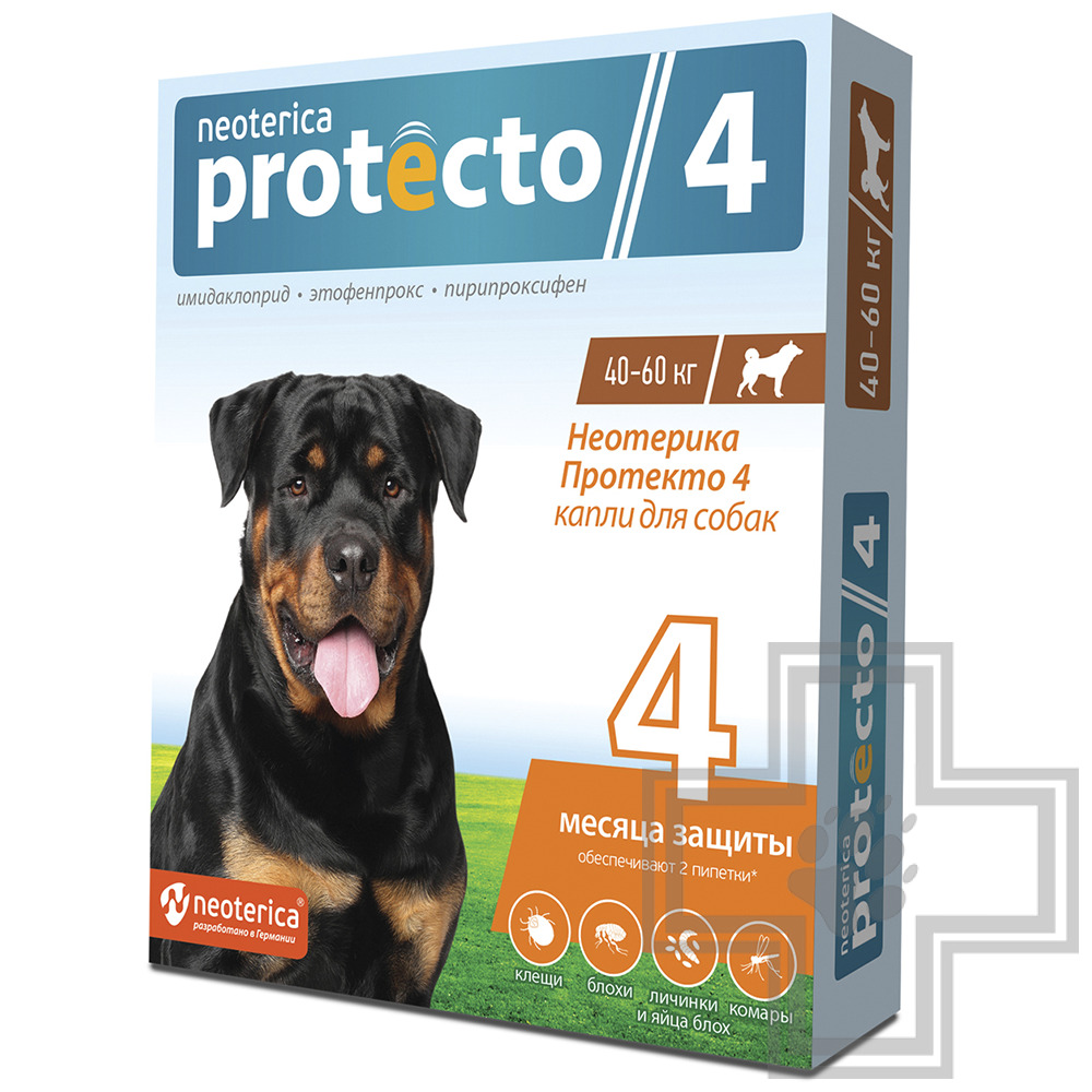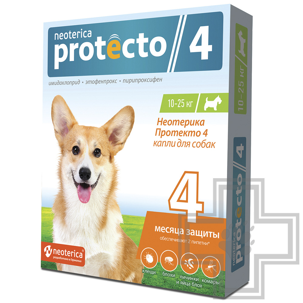 | Инструкция по применению | Неотерика Протекто 4 применяют кошкам, собакам и декоративным кроликам с 12-недельного возраста при энтомозах (блохи, вши, власоеды), отодектозе, псороптозе, нотоэдрозе, саркоптозе, демодекозе, поражении иксодовыми клещами и в целях защиты животных от нападения двукрылых кровососущих насекомых и профилактики трансмиссивных заболеваний (бабезиоз, боррелиоз, дирофиляриоз).