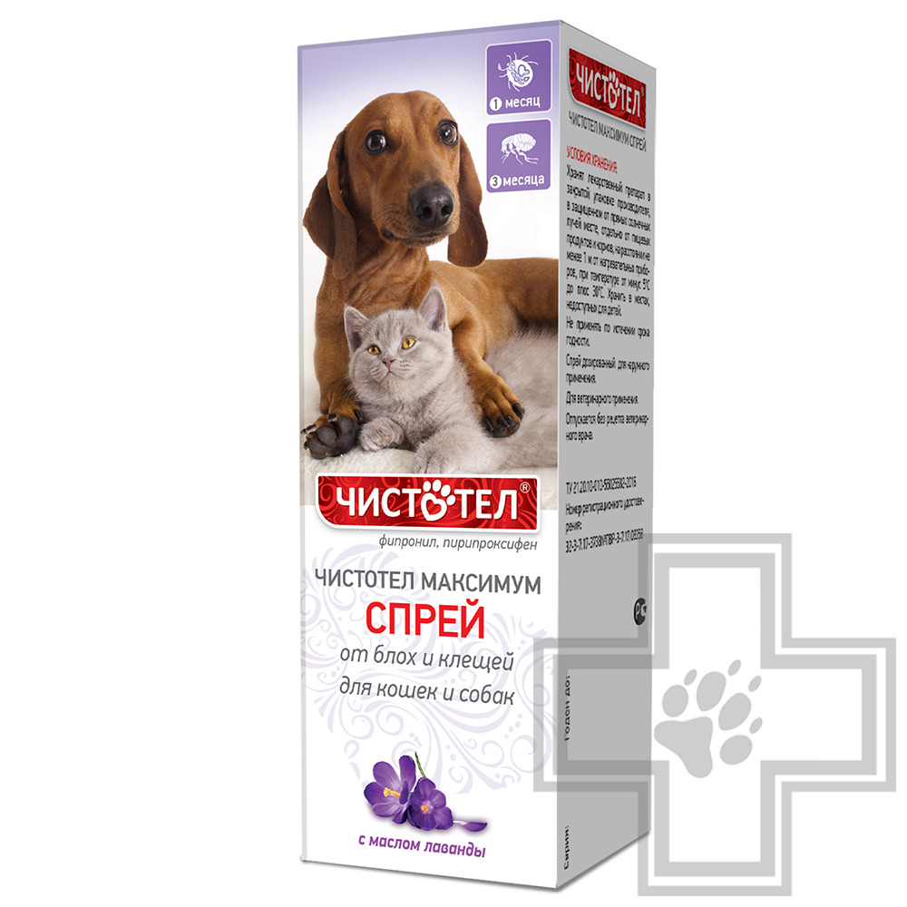 Чистотел Максимум спрей (Chistotel Maximum spray) применяют для уничтожения иксодовых и чесоточных клещей, блох, вшей, власоедов, паразитирующих на собаках и кошках, а также для предотвращения нападения эктопаразитов на животных.