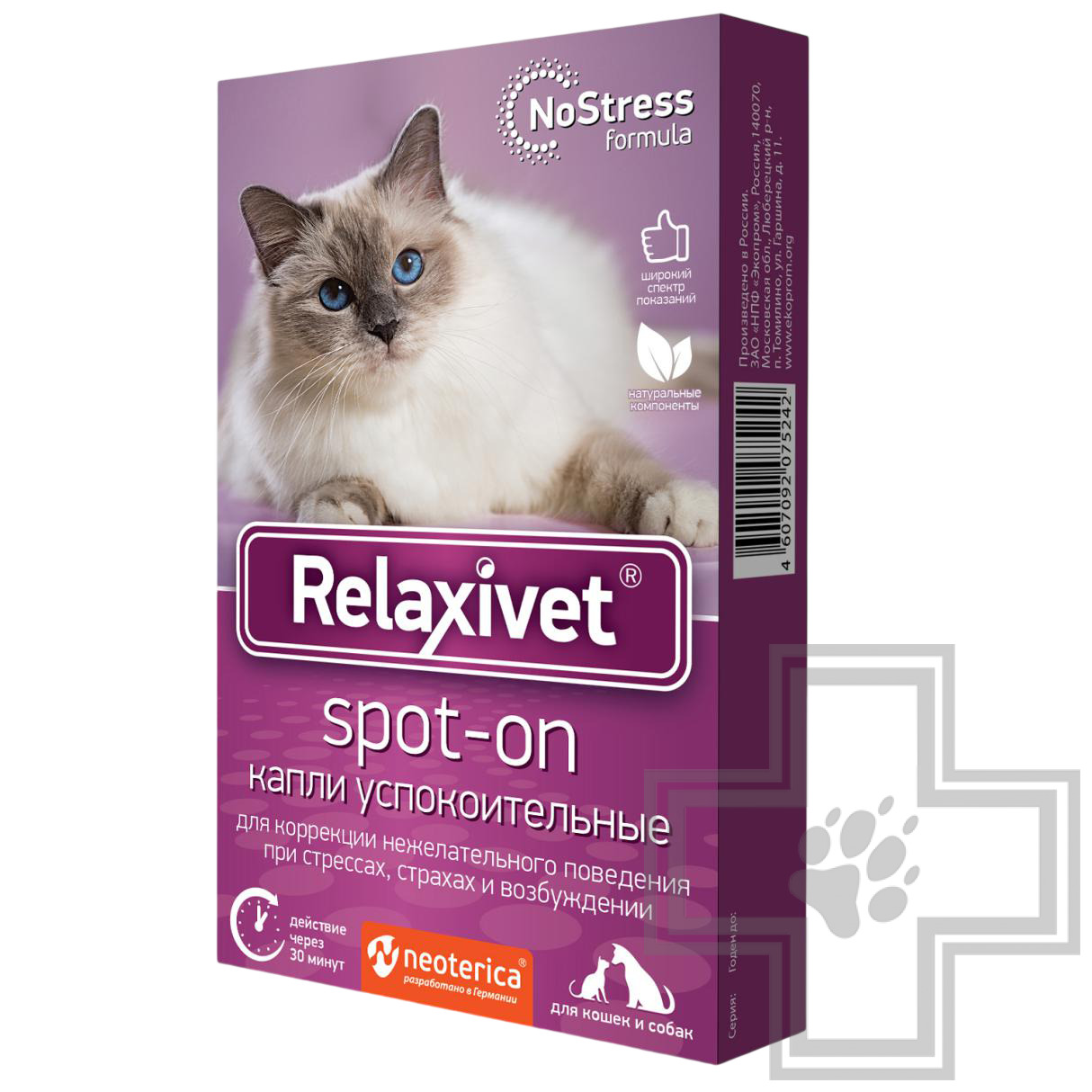 Relaxivet Spot-on (Релаксивет спот-он) Капли успокоительные для коррекции нежелательного поведения при стрессах, страхах и возбуждении у кошек и собак.