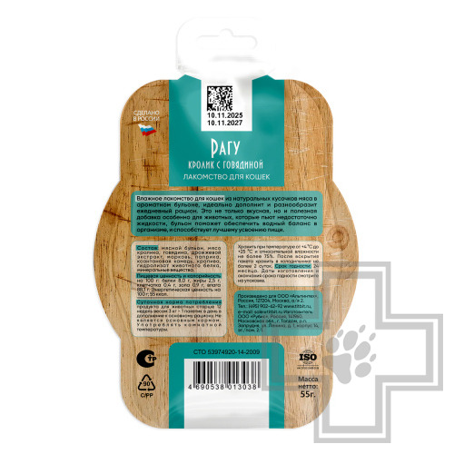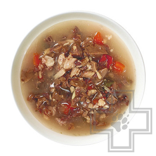 мясной бульон, мясо кролика, говядина, дрожжевой экстракт, морковь, паприка, ксантановая камедь, крапива, гидролизат животного белка, минеральные вещества. Питательные вещества: белки 8 г, жиры 2,5 г, клетчатка 0,4 г, зола 0,9 г, влага 88,1 г. Энергетическая ценность на 100 г: 55 кКкал.