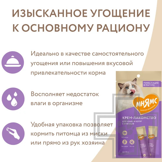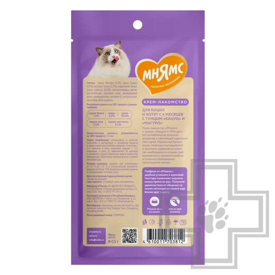 Крем-лакомство с тунцом Кацуо и Магуро Тёмно-красное мясо деликатесного малого тунца и красное стейковое мясо желтопёрого тунца Крем-лакомство «Мнямс» с тунцом – это изысканное угощение с нежнейшей кремовой консистенцией. Утонченный вкус приводит кошек в восторг, а яркие эмоции довольных любимцев при кормлении с рук дарят хозяевам ощущение полного счастья. Подается как порционное угощение, или добавляется в виде аппетитного соуса к основному рациону для обогащения вкуса привычных блюд. Изготовлено по новейшей японской технологии и соответствует мировым стандартам качества.